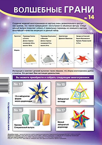Studio : Polyhedr. We create models of polyhedra. Publisher : Polyhedr. We create models of polyhedra. Binding : Toy Product Description Set to assemble "Pyramids". Difficulty level: Easy (does not require experience and additional skills). Every issue includes historical background, description of a polyhedron, assembly instructions with pictures in color. Sets parts are made of colored cardboard with a lacquer coating, they are precut and bent. Sets are packed in heavy-duty polypropylene envelopes, A4 format (210x297 mm). https://youtu.be/6EX4i5F2_AE 0