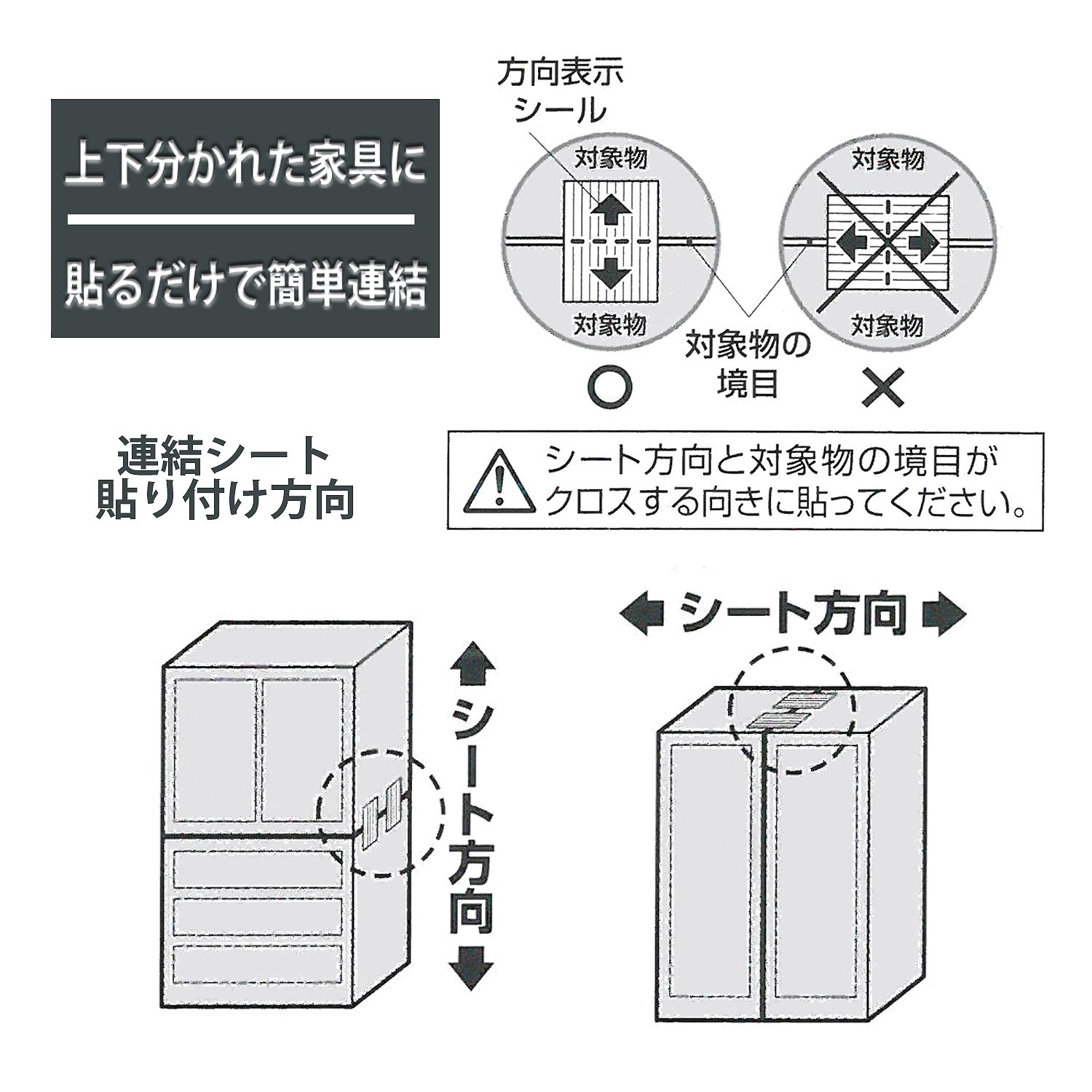 ● Features: Concatenation of cupboards, bookshelves, chests of drawers, lockers, cabinets, etc. that are divided into upper and lower parts, and connection of top plates of adjacent fixtures and stacked shelves etc. Tack fitting sheet