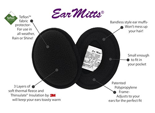 Binding : Apparel Product Description Ear Mitts® are designed to fit securely on your ears, keeping them protected from the wind and cold. Three layers - soft and durable lightweight anti-pill fleece, 100 gram ThinsulateTM Insulation from 3M, and a fleece inner lining - keep warmth in and the wind and cold air out. A patented flexible polypropylene frame adjusts to your ears and becomes more comfortable the more you wear them. A stylish alternative to traditional scarves and band ear muffs, Ear Mitts® provide warmth and comfort without interfering with your hairstyle! They also fit comfortably under helmets, caps, stocking hats, hard hats - any headgear! Comes in two sizes- standard and small. The design also permits unrestricted hearing during use. Compact enough to fit in a pocket, fanny pack, or hand bag. For care, hand-wash and dry flat, no bleach, no iron. Available in fleece, denim, faux fur, faux leather, faux suede, velvet, sparkle, and embellished with Swarovski Crystals - See our other products on Amazon! 0