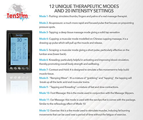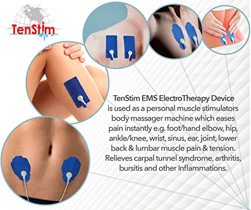 Studio : Tenstim Publisher : Tenstim Binding : Health and Beauty Product Description SMART THERAPY: Featuring our Upgraded Version TENSTIM MD Model which mimics the realistic traditional Chinese massage (TuiNa) sensations and acupuncture technology. Our professional FDA cleared EMS pulse massager device offers a large LCD display with LED backlight and 12 unique therapeutic modes. There are 20 independent intensity settings. BONUS EAR CLIP INCLUDED FOR EAR MASSAGE THERAPY: A bonus Earclip included, which works similar to the reflexology, by stimulating the ear you effectively stimulates various parts of your nerves and muscles and relaxes your body. INSTANT PAIN RELIEF FOR THE ENTIRE BODY: Super relaxing to use after a stressful day of work. Eases pain rapidly e.g. foot/hand elbow, hip, ankle/knee, wrist, sinus, ear, joint, lower back lumbar muscle pain. Relieves carpal tunnel syndrome, arthritis bursitis. Used in professional physical therapy pain management facilities. 100% chiropractor recommended to relieve intense body pain. DUAL CHANNELS: Includes independent mode controls for each of its 2 channels. You can treat two different body parts at once with different settings! 2 REUSABLE ELECTRODE PAD SETS: This device comes with a set of large pads and a set of extra-large pads. 1 set is equal to 2 pads so there are 4 pads in total. Each package includes 2 cords, each cord has the ability to attach 2 pads. The pad board is to stick the pads to when you are done using the device. PORTABLE RECHARGEABLE: This device is rechargeable with a wall adapter. It also has the USB to Micro USB charging capabilities (Included). 1 YEAR WARRANTY: Since customer satisfaction is our priority, we offer a 1 year warranty. PACKAGE CONTENTS: 1 TenStim MD Unit 1 set of Large Pads 1 set of XL Pads 2 Electrode Wires USB Cable AC Adapter Pad Board Ear Clip for sinus and ear infections Instructions Manual 0