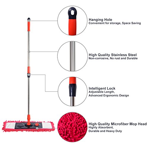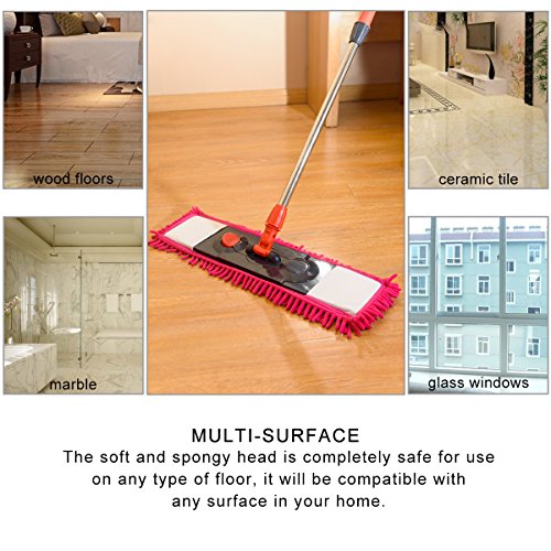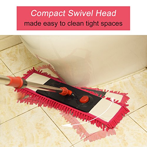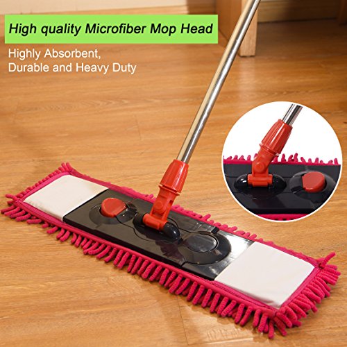 NFHOME 24" Professional Microfiber Flat Chenille Mop, Wet/Dry Floor Mop With Stainless Steel Telescopic Extension Handle for Hardwood, Laminate and Tile Flooring, Red