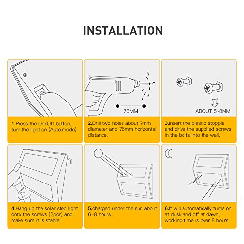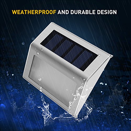 - WEATHERPROOF: Waterproof rating is IP44 and durable design, solid stainless steel construction for withstanding windy, rainy and wet conditions. No wiring required, mounted vertically or flatly on the surface (Screws included). Perfect for illuminating stairs, paths, decks, patios, gardens, lawns etc.