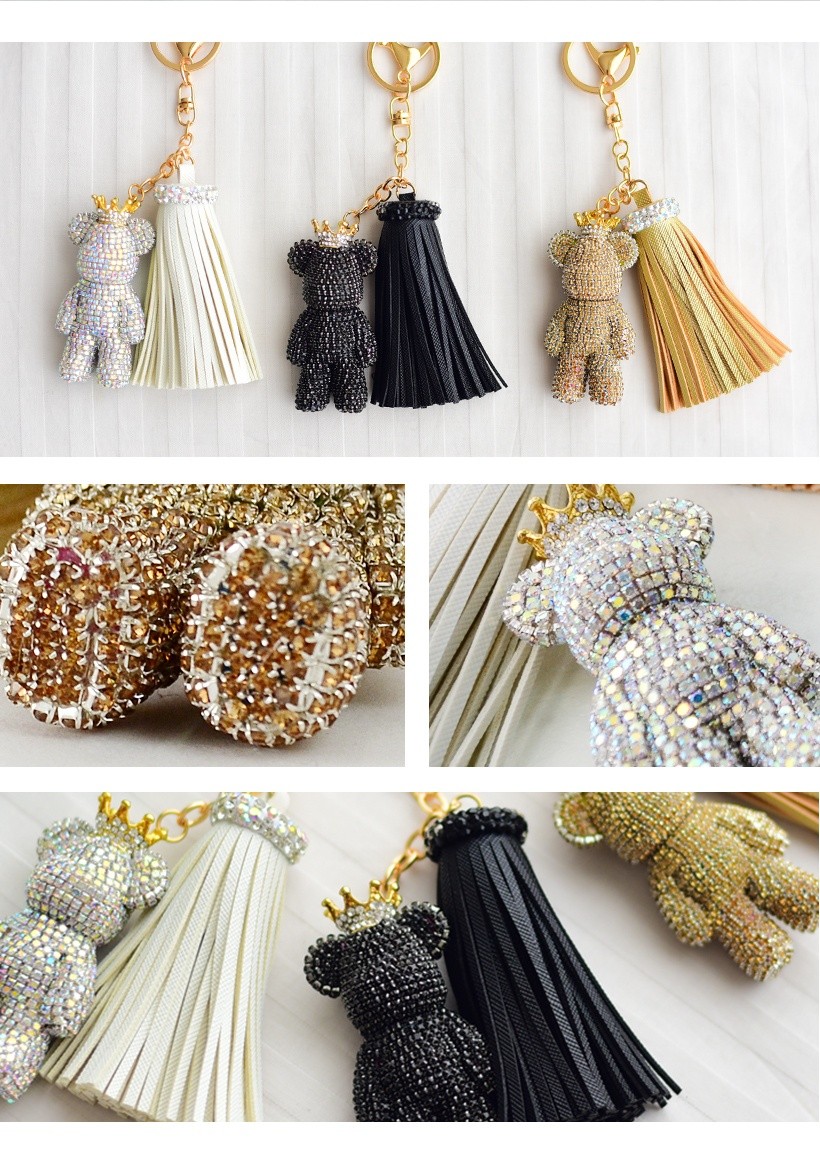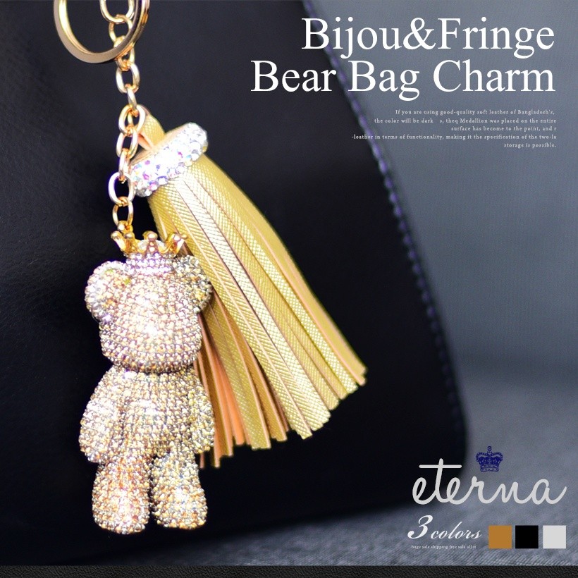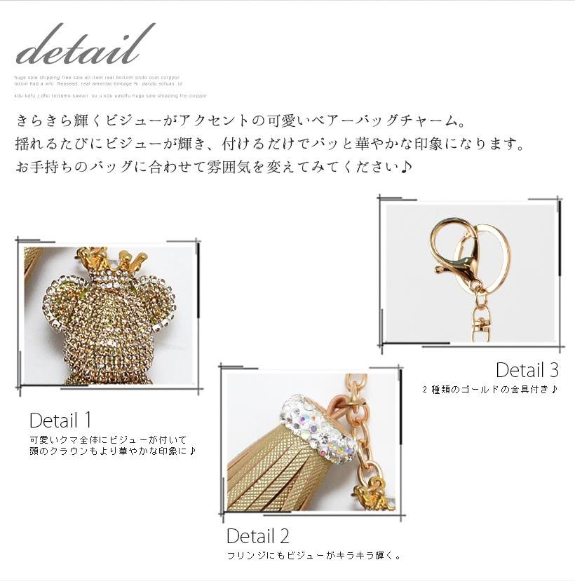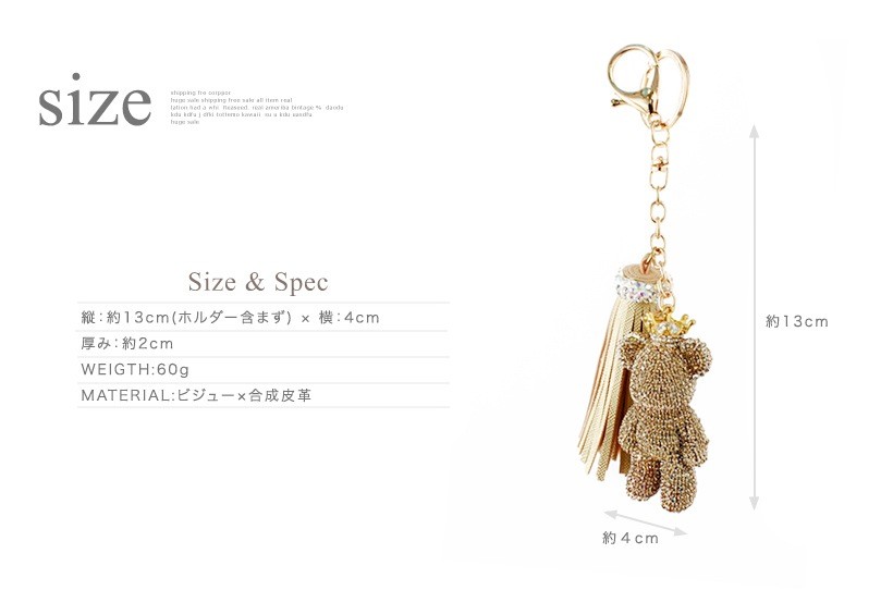 キラキラしたパーツで出来たクマのバッグチャーム。インパクトのある大きいタッセルとセットでボリュームがあるので、バッグに付けてもしっかりアクセントに。とっても女性らしいディテールでシンプルなバッグのアクセントでもキーホルダーとしてもOK!使い分けのできる2種類のホルダーも嬉しいポイント!●SIZE:高さ:約13cm(ホルダー含まず) / 幅:約4cm / 厚み:約2cm●重さ:約60g●素材:ビジュー×合成皮革[カラー]クリスタル・ゴールド・ブラックメーカーより取り寄せ商品のため、在庫状況によっては欠品・廃盤の可能性があります。あらかじめご了承ください。