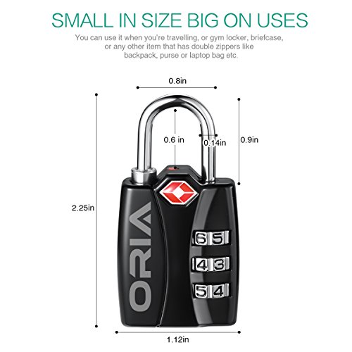 -. Binding : Tools & Home Improvement -. Brand : Oria -. Color : Black -. EAN : 0603964452177 -. Feature : High quality for long using: This tsa approved lage lock was designed with durability and strength in mind / Provide a safe and reliable protection: It will not be damaged after checking by airport security / Red "lock open" alert indicator: There is red button on the top that allows you to immediately recognize that the lock has been opened by a tsa agent / Easy to use: The locks come with a preset 0-0-0 combination and detailed instructions / Convenient & wide on uses: This 2 pack lock is of small size, portable -. IsAutographed : 0 -. Label : Oria -. Manufacturer : Oria -. Model : TSA Lock -. MPN : TSA Lock -. PackageQuantity : 1 -. PartNumber : TSA Lock -. ProductGroup : Home Improvement -. ProductTypeName : HARDWARE -. Publisher : Oria -. Studio : Oria -. Title : Oria TSA Lock Approved Locks, 3 Digit Combination Travel Lock with Alert, The Protection for Travel Safety and Security, 2 Piece -. UPC : 603964452177
