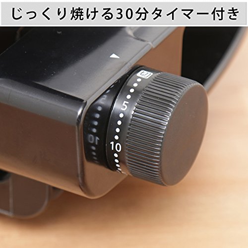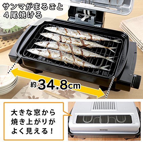 焼き網サイズ(cm):幅約34.8×奥行約21.5 コードの長さ:約1.5m 主要材質:ふた/アルミニウム、ガラス窓/耐熱強化ガラス、取っ手・本体/フェノール樹脂、焼き網/ステンレス、水受け皿/スチール