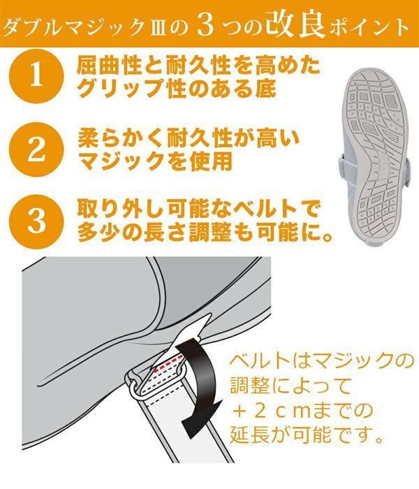 ダブルマジックIIIは、みなさまの「たくさんの声」によって改良を重ねて生まれた靴です。甲が大きく開く事で足入れがしやすい形状や、甲全体に優しくフィットし、サイズ調節も簡単なベルトなどの機能はそのままに、インソールも、底も、より機能的に生まれ変わりました。 |