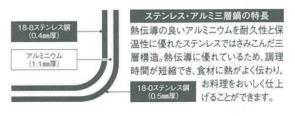 | 熱伝導性の良いアルミニウムを耐久性と保温性に優れたステンレスではさみこんだ三層構造の両手鍋です。熱伝導性に優れているため、調理時間が短縮でき、食材に熱がよく伝わり、お料理をおいしく仕上げることができます。ハンドルは握りやすく持ちやすい形状となっており、内面はサビにくい18-8ステンレス製でミラー仕上げのため、お手入れが簡単です。 |
