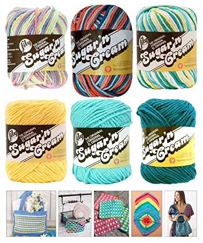 Variety Assortment Lily Sugar'n Cream Yarn 100% Cotton Solids and Ombres (6-Pack) Medium #4 Worsted with 5 Patterns