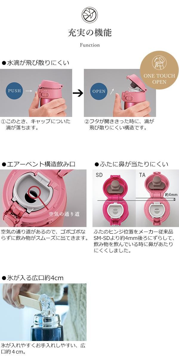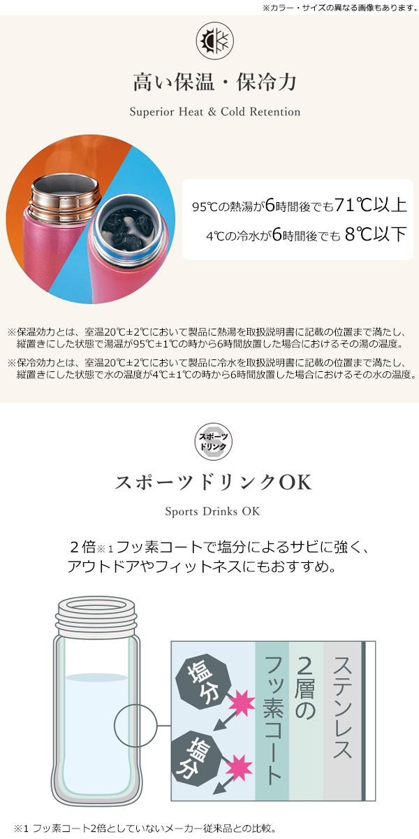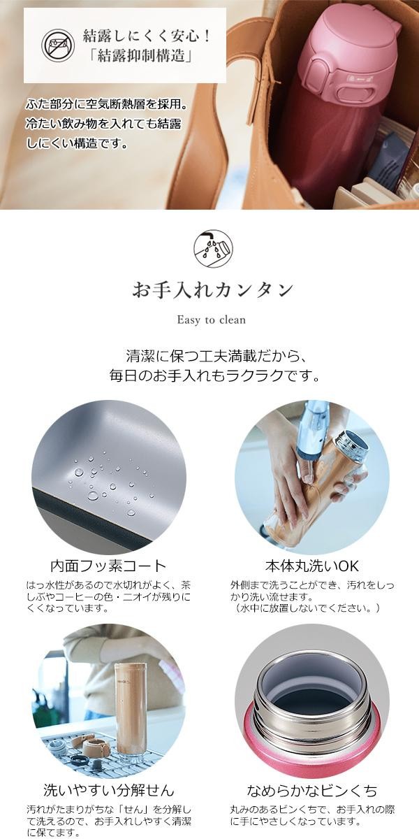 毎日使うものだから軽量&コンパクトで、あきのこないシンプルなデザインを♪高い保温・保冷効力があり、スポーツドリンクにもご使用いただけます。本体は丸洗いでき、汚れがたまりがちな「せん」も分解して洗えるので毎日のお手入れもラクラクです。 |