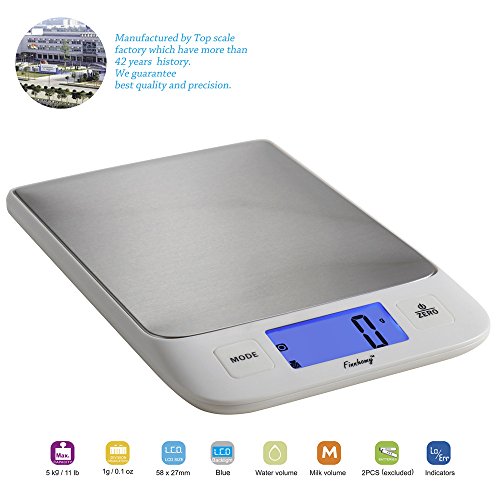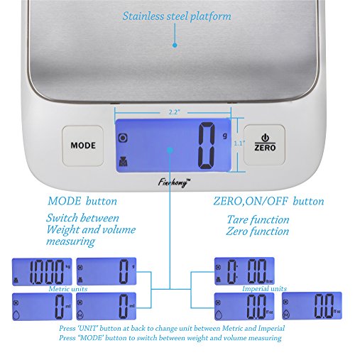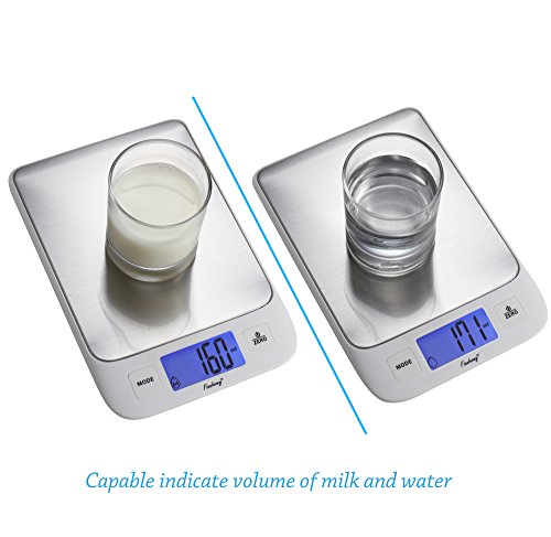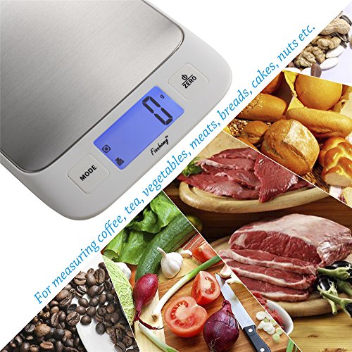 Finnhomy Digital Kitchen Scale for Food Water or Milk Multifunction Weight and Liquid Volume for Cooking Baking Scale Big Clear Backlight LCD Display Stainless Steel Platform 5kg 11lb Tare Function
