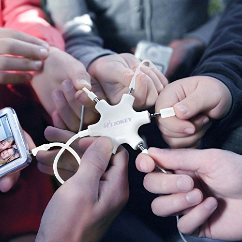 Sharing Music with Friends:3.5mm headphone adapter splits line into five 3.5mm ports. Connect up to five headphones to one device for sharing music with friends,The Splitter is perfect for listening to music with friends,learning in classroom environments, or sharing a DVD in the backseat of a car.
