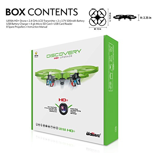 • INCLUDES: 1 x U818A HD+ RC Quadcopter with 1280x720P HD Camera, 1 x 2.4G Transmitter with LCD Display (4xAA batteries NOT INCLUDED), 2 x 3.7V 500mAh Li-Po Battery, 1 x 4GB Micro SD Card, 1 x USB Card Reader, 1 x 2-Ch Battery Charger, 4 x Extra Blades, 1 x User Manual