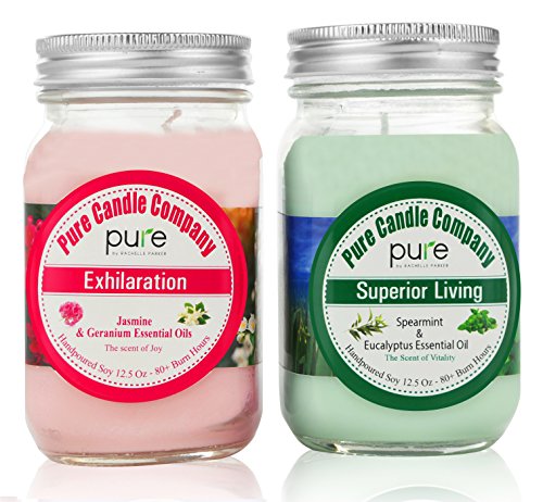 PURE Naturally Scented Aromatherapy Candles Gift Set includes Jasmine Geranium Soy Candle and Spearmint Eucalyptus Large Mason Jar Candle 12.5 oz. Natural Home Fragrance Candle is Best Women Gift!
