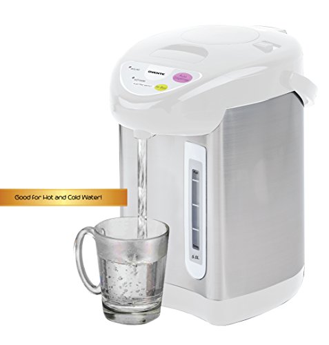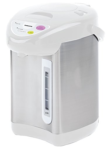 Ovente Deluxe water boiler and warmer has a high performance 700 Watt motor that boils water faster than a conventional stovetop kettle. Key features are Reboil and Automatic Keep Warm Function that keeps the water hot for hours. It has a 5.0 Liter Water Capacity that is suitable for gatherings, parties and home use. The water dispenser is safely equipped with a Boil Dry Protection that automatically shuts off the unit once there is no water detected inside the stainless steel water tank. Non-slip 360-degrees rotary power base that operates safely at any position. Water level indicator to provide accuracy in water volume. Comes with an easy to open flip-top lid, pour water easily into the water tank. Equipped with an ergonomic carrying handle for mobility and camping. Advanced Three way water dispense: Automatic, Pump, Cup switch. Beautifully enclosed in stainless steel outer coating with stainless steel inner tank that gives the Ovente water boiler a modern yet conventional look. Comes with a 1-Year Limited Manufacturer's Warranty.Feature