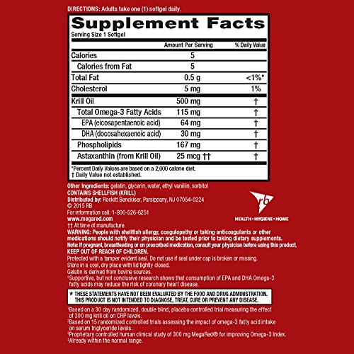 MegaRed Omega 3 Krill Oil supplements provide an optimal combination of omega-3 fatty acids and the powerful antioxidant astaxanthin to support heart health in a once daily softgel.* Supportive research has shown that consumption of EPA and DHA omega-3 fatty acids may reduce the risk of coronary heart disease. MegaRed Omega-3 Krill Oil has been shown to significantly increase your omega-3 index in just 30 days.** MegaRed Krill Oil is absorbed and carried in phospholipid form so it is easily recognized and utilized by your body. MegaRed Krill Oil also contains high quality oil from 100% pure Antarctic krill. And because it's krill oil as opposed to fish oil, MegaRed Krill Oil has no fishy aftertaste or odor.Feature