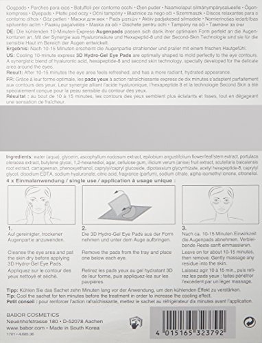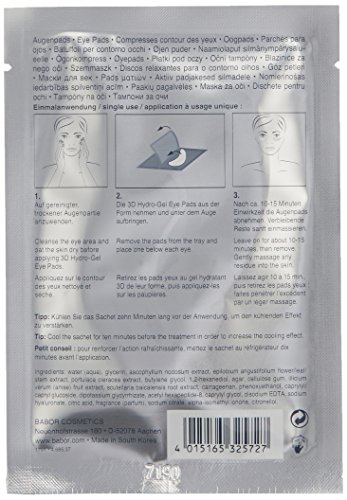 For Dry Skin. Cooling 3D Hydro-Gel Eye Pads are optimally shaped to mold perfectly to your eye contours. Contains a synergistic blend of Hyaluronic Acid, Hexapeptide-8 and second skin technology, specially developed for the delicate area around the eyes. After 10-15 minutes the eye area feels refreshed, and has a more radiant, hydrated appearance. The result is a refreshed, more radiant and hydrated appearance. Cooling and hydrating hydro-gel eye pads contain natural hyaluronic acid for refreshing hydration. Leaves skin looking plumped and hydrated. Made with all natural ingredients such as: Hyaluronic Acid and Hexapeptide-8. All BABOR products are CRUELTY FREE and Never Tested on Animals. Vegan. Made in Germany. BABOR is the 2nd most sustainable luxury brand in Germany.