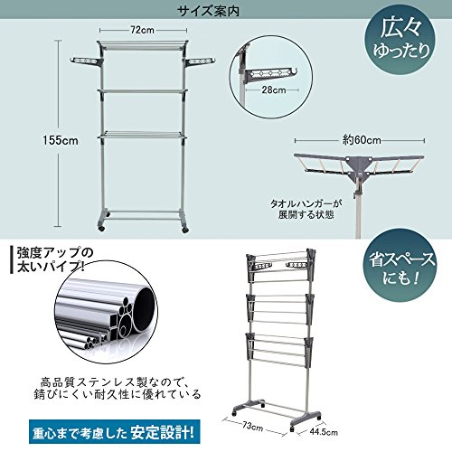 ヨコ伸縮で、あなたにピッタリ幅!家族4,、5,人分でもしっかり干せます。タオルハンガーは畳める設計で、使用しない時収納しやすいです。