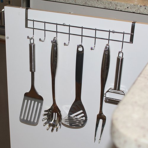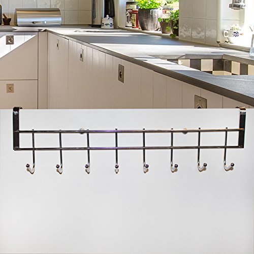 HEAVY DUTY HOLDER: Our 36cm / 14.17" stainless steel over-the-door hanger can hold a wide range of accessories. Whether you are using it in the home or an industrial environment, its perfect for organization and extra storage. This metal rack fits most cupboards.