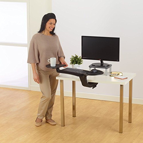 -. Feature : Dual mouse platforms swivel left and right, and have independent tilt and height adjustment. / Platform adjusts in height up to 12.75", tilts +/-15 degrees, and rotates 360 degrees for use in straight or corner workstation layouts. / Longer 9.5" arm allows users to sit or stand while typing. / Microfiber cloth wrist rest wicks away moisture and dirt, keeping it soft and comfortable.