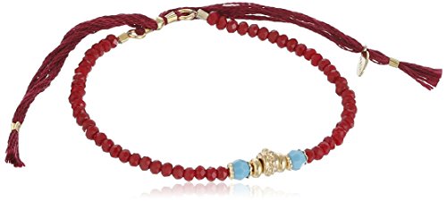 -. Feature : Slide bracelet with faceted-red beads featuring gold-tone centerpiece flanked by light-blue beads