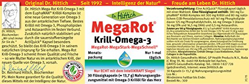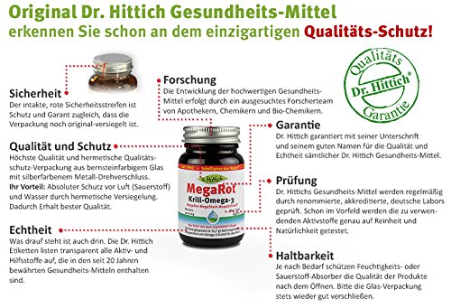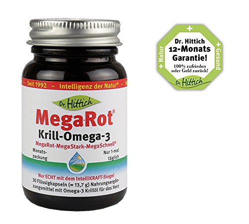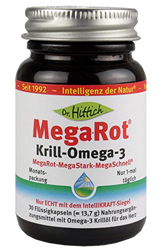 -. Feature : Antarktischer Krill - herzgesundes Super Omega-3 Es ist dieser natürliche, feste Verbund aus Omega-3, Phospholipiden und Astaxanthin - ein Dreiklang - der den Krill so wertvoll macht und ihm seine starke Kraft verleiht. / Die Kapselhülle von Mega-Rot® besteht rein aus marinem Collagen. Denn Dr. Hittich verzichtet konsequent auf unnötige Hilfsstoffe: ohne Gelatine von Schwein oder Rind, frei von Gentechnik und frei von Konservierungsstoffen und ohne mögliche negative Wechselwirkungen mit dem hochwertigen Krillöl. / Nachhaltige Gewinnung im Einklang mit der Natur Dr. Hittich stellt bei seinen Premium-Rohstoffen höchste Ansprüche an Nachhaltigkeit und ökologisch verantwortliches Handeln. Nur die Zusammenarbeit mit Erzeugern, welche die strengen Standards des "Eco-Harvesting" zu 100% erfüllen, wird akzeptiert. Denn nur bei dieser Methode wird unerwünschter Beifang garantiert vermieden und wird das Krillöl direkt an Board verarbeitet und behält so seine Qualität und Kraft. / EuphaMAX® - echtes Krillöl in Forschungs-Qualität • Bestes antarktisches Krillöl aus nachhaltiger Fischerei. • 7,5-mal mehr stabiles Astaxanthin als übliches Krillöl. • 100% natürlicher O2B Peroxidations-Schutz von der Extraktion bis zum Verbrauch. • Patentierte ActiQuick® Kapsel für besten Schutz von außen und noch schnelleren Freisetzung. • Kein Aufstoßen. Kein Fischgeruch. Maximale Omega-3-Kraft in nur einer kleinen, leicht zu schluckenden Kapsel! / 100 % zufrieden oder Geld zurück! Ohne lästige Fragen. Ohne Wenn und Aber. Eine bessere Qualitäts-Garantie kann es nicht geben!