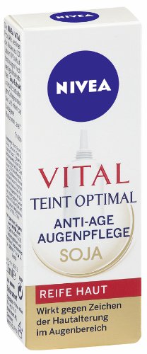 -. Binding : Health and Beauty -. Brand : Nivea -. Department : men, women, unisex-adult -. EAN : 4005808198719 -. Feature : Reduces the appearance of wrinkles and lines around the eyes / Firms and plumps-up the delicate eye area / Reduces puffiness and dark circles around the eyes / Especially developed for the needs of mature skin / Made and developed in Germany -. IsAdultProduct : 0 -. IsAutographed : 0 -. IsMemorabilia : 0 -. Label : Nivea -. Manufacturer : Nivea -. Model : 86613 -. MPN : 86613 -. PackageQuantity : 1 -. PartNumber : 86613 -. ProductGroup : Beauty -. ProductTypeName : BEAUTY -. Publisher : Nivea -. Studio : Nivea -. Title : Nivea Visage Vital Teint Complexion Optimal Anti-Age Soy Eye Care Cream 0.5 fl. oz - 15ml