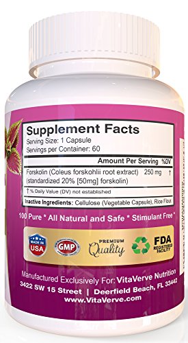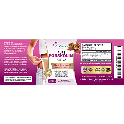 -. Binding : Health and Beauty -. Brand : VitaVerve Nutrition -. Color : Brown -. Department : womens -. EAN : 0646437581202 -. Feature : ✔ MAXIMUM POTENCY: Our superior quality Pure Forskolin supplement is standardised to 20%. One x 250mg dose taken twice a day has been scientifically proven to provide the fastest and most sustainable weight loss, fat burn and metabolism boost. It's far more powerful than the lower dosage Forskolin Supplements flooding the market - which are not only ineffective but also a total waste of your money! / ✔ BURN BELLY FAT AND KEEP THE MUSCLE:Pure Forskolin does not burn fat and muscle in equal ratios. It targets the fat cells themselves and protects the muscle. When you burn fat, you actually decrease your Body Mass Index (BMI). Forskolin is highly recommended as an appetite suppressant and fat burner because if helps you burn belly fat in those "hard to lose" areas. Forskolin weight loss supplements are also known to increase metabolism in both men and women. / ✔ POTENT & POWERFUL WEIGHT LOSS SUPPLEMENT: Our 100% Pure Forskolin extract is proven to yield powerful results to reduce body fat and build lean muscle mass without the negative effects of caffeinated thermogenic supplements. It will help you lose weight, suppress appetite, burn fat, boost energy, improve mood and digestive health plus increase your metabolism ensuring a lean and healthy body. / ✔ FDA APPROVED & USA MADE: Our premium quality Pure Forskolin supplement is manufactured right here in the USA, within stringently controlled facilities, following Good Manufacturing Standards. Its pharmaceutical grade manufacturing process ensures that every single capsule has the highest potency and absolutely perfect Forskolin dosage that provide maximum weight loss benefits. / ✔ 100% MONEY BACK GUARANTEE: Are you strling to lose weight? Are you ready to drop the inches around your waist you've put on over the years? Our 100% Pure Forskolin can give you the results your desire. Should you be, for any reason, unhappy with our product we will promptly refund 100% of your purchase. You have nothing to lose and the risk is on us. We've set the standard for Customer Service, and your satisfaction is our top priority. -. IsAdultProduct : 0 -. Label : VitaVerve Nutrition -. LegalDisclaimer : Safety Information Do not exceed recommended dose. Pregnant or nursing mothers, children under the age of 18, and individuals with a known medical condition should consult a physician before using this or any dietary supplement. Legal Disclaimer These statements have not been evaluated by the Food and Drug Administration. This product is not intended to diagnose, treat, cure or prevent any disease.We recommend that you do not rely solely on the information presented and that you always read labels, warnings, and directions before using or consuming a product. Please see our full disclaimer below. -. Manufacturer : VitaVerve Nutrition -. MPN : L3-VRSN-2VK2 -. PackageQuantity : 1 -. PartNumber : L3-VRSN-2VK2 -. ProductGroup : Health and Beauty -. ProductTypeName : HEALTH_PERSONAL_CARE -. Publisher : VitaVerve Nutrition -. Size : 60 -. Studio : VitaVerve Nutrition -. Title : 100% Pure Forskolin Extract For Extreme Weight Loss ★ Best Fat Burner, Metabolism Booster, Appetite Suppressant & Best Carb Blocker ★ 250mg Maximum Strength Diet Pills for Woman and Men. -. UPC : 646437581202