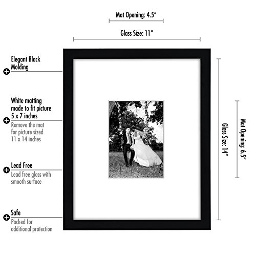 DESIGN: A frame should be as beautiful as the photograph it holds. This hand crafted 11x14 inch sleek black frame and white mat with a 5x7 inch opening will showcase your favorite memories for years to come.