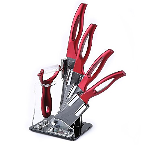 Set include: 6-inch Chef's Knife, 5-inch Utility (Slicing), 4-inch Fruit Knife, 3-inch Paring, Vegetable Peeler, Acrylic Knife Holder
