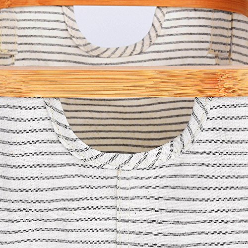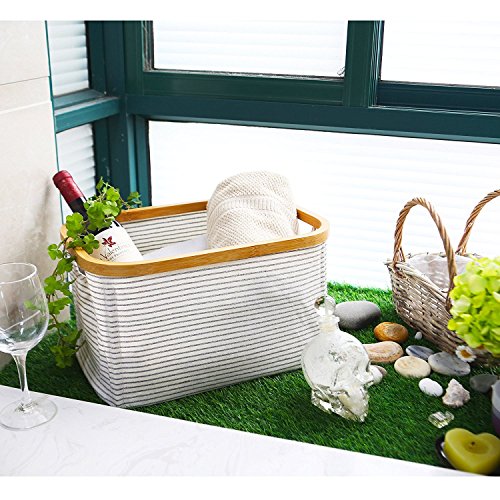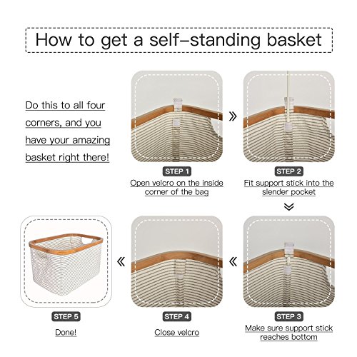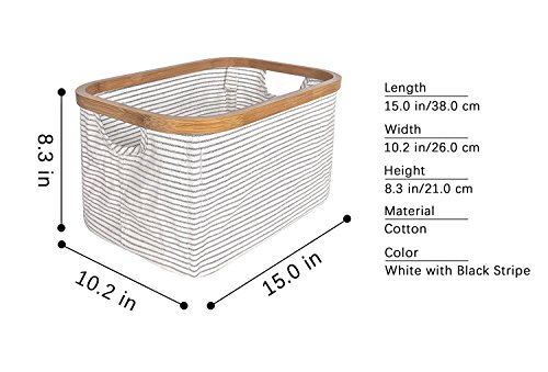 - ECO-FRIENDLY BASKET: Premium cotton and bamboo frame, without any chemicals or strong smells, keeping our storage basket healthy, soft and skin-friendly touch. Also, it matches well with your house decoration by its white with black stripe color. Please refer to the picture for an easy assembling instruction.