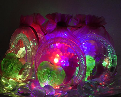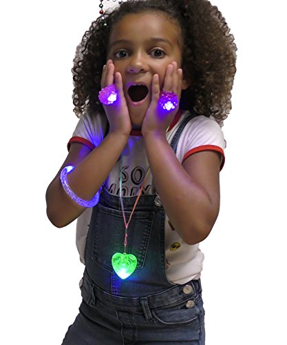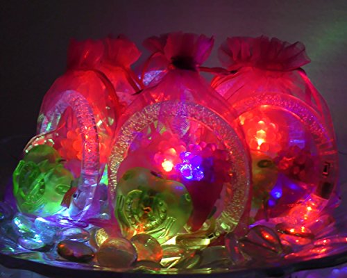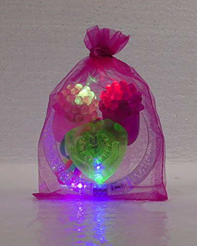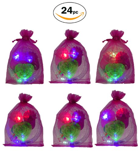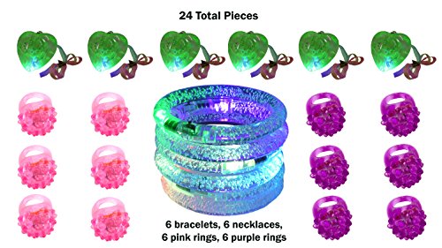 -. Feature : CONTENTS: 24 total pieces of Light up Jewelry: (6) Pink Bumpy Rings (6) Purple Bumpy Rings (6) Bubble Bracelets (6) Bubble Necklaces (6) Pink Organza Bags / PARTY PACK: Each Party Pack comes with (6) Pink Organza Party Favor Bags pre-packed with 2 rings, 1 bracelet, and 1 necklace. / CONVENIENCE: We've pre-packed the Organza Party Favor bags for you, so there's nothing left for you to do but pass them out / PERFECT FOR: Birthday party favors, wedding favors, bachelorette party favors, Halloween treats, costume accessories, party light toys, Easter gifts, Christmas party favors, stocking stuffers, birthday goodie bags, treasure chests, glow in the dark party supplies, trick or treat bags, and glo parties! / BATTERIES: Already Included and are non-replaceable or rechargeable. Will last a long time, approximately 4-6 hours with continuous use.