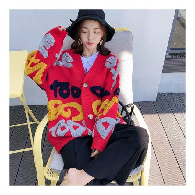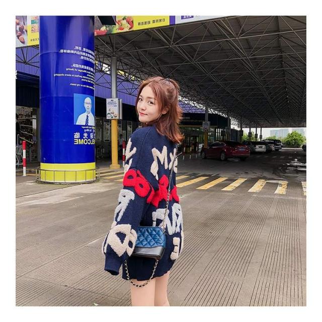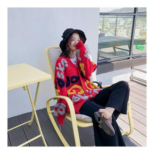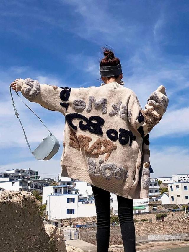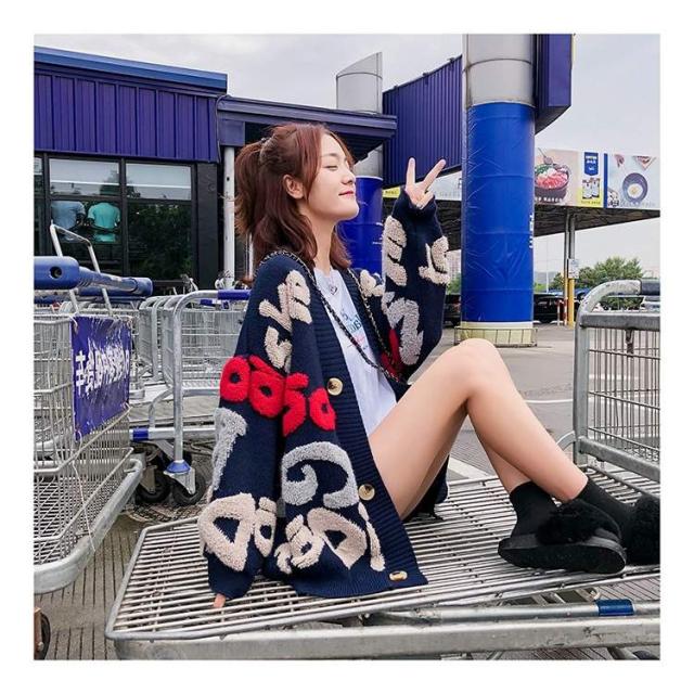 トレンド カーディガン モコモコ レタリング カジュアル ゆったり 秋冬 ワンサイズ