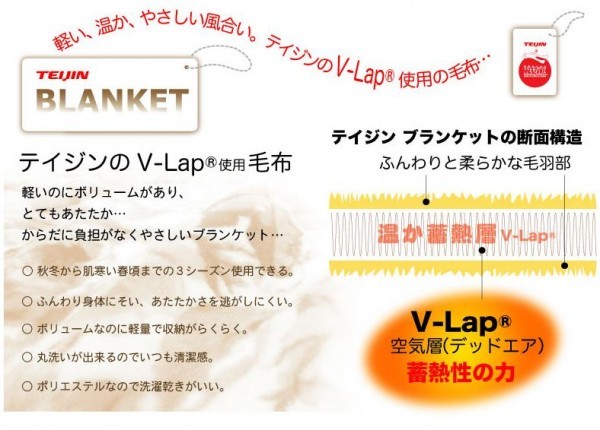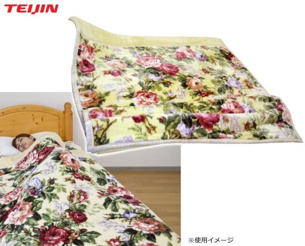 | テイジンオリジナル素材のV-Lap(R)を使用した、あったか掛け毛布です。毛羽部の隙間の空気層が熱をにがしにくく、保温力に優れていますので、ふんわりやわらかな肌触りであたたかく、快適におやすみいただけます。また、ご家庭で手洗いが可能なので、汚れても手軽にお手入れができます。色彩ゆたかで美しいフラワー柄がベッドルームを華やかに演出します。 |