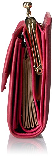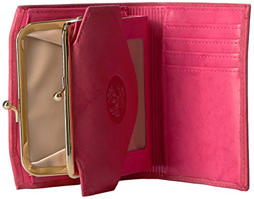 Authentic crunch leather, rich floral emboss heiress french purse features a 4 section accordion card case with i.D. Window, outside framed coin purse with slip pocket, bill compartment, additional credit card slots and attached key ring.