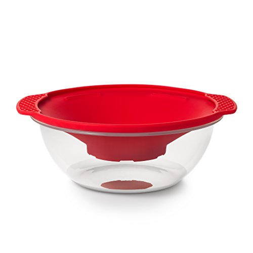 Multi-function lid secures closed for shaking ingredients and can be used as a serving bowl