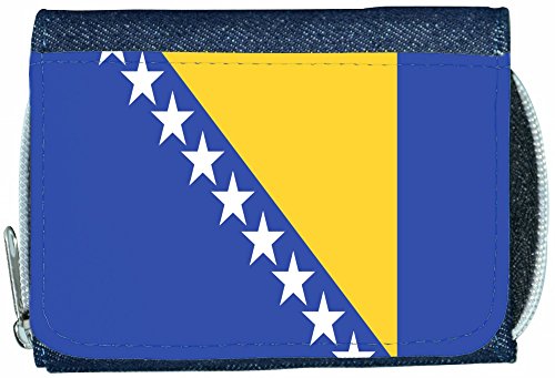 Binding : Apparel Product Description High quality wallet - Bosnia and Herzegovina Flag Denim Wallet. Denim back, printed front flap. Full zip opens on divided area for two coin sections. Flap area over 4/5 credit card sections, clear photograph/ID section and large note section. 0