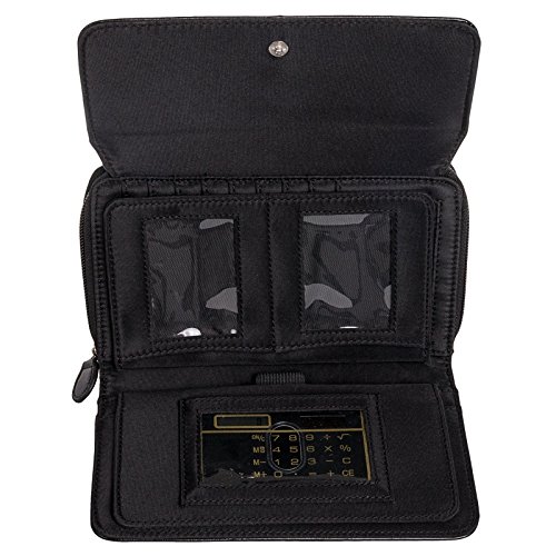 Mundi is packed with all the essentials needed to keep any woman organized. The interior of this wallet features 8 credit card slots, 5 ID/ photo windows, 2 checkbook sized slip pockets, 1 pen loop, and a solar powered calculator. The outer large zipper pocket, coin pouch, and additional slip pocket provides you with even more storage options while on the go. Stay versatile and drop this wallet in your bag or carry it around as a clutch. Measures 7.75" x 4.75" x 1.75".