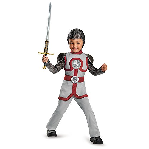 -. Feature : Size: S (Fits size 2T), M (Fits sizes 3T-4T) / Includes Jumpsuit with Padded Chest, Attached Belt with Soft Buckle, Pair Of Attached Shoulder Pieces, and Character Hood / Toy Sword Not Included