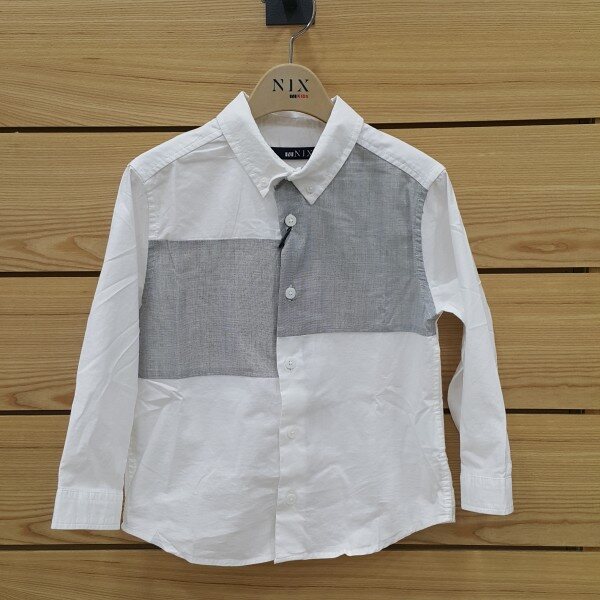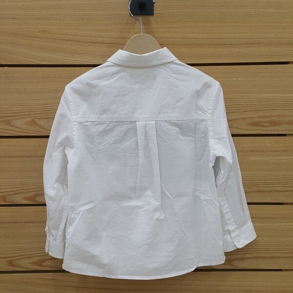 남아 버튼다운 셔츠로 깨끗한 화이트 몸판에 앞 가슴에 절개 배색이 있는 디자인입니다