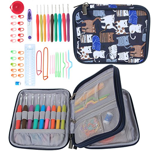 Teamoy Ergonomic Crochet Hooks Set, Knitting Needle Kit, Zipper Organizer Case With 9pcs 2mm to 6mm Soft Grip Crochets and Complete Accessories, Small Volume and Convenient to Carry, Cats Blue