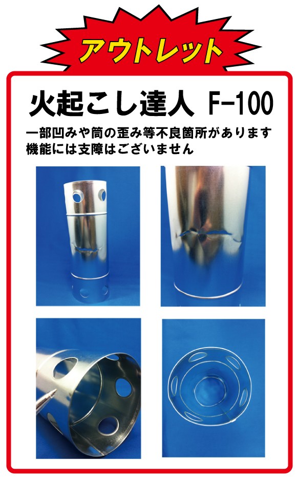 一部凹み・歪みがあるため、金額を安くご提供性能に違いはございません。商品の説明1、「火起こし達人」をバーベキューコンロの目皿の上に立て、丸めた 新聞紙を入れ、さらに二つ折りにした割り箸を入れていきます。 2、その上に木炭を入れ、下穴から新聞紙に着火、木炭に完全に火が着くまで約5 分(備長炭の場合は30 ~40 分)待ちます。 3、上穴に火バサミを差し込んで「火起こし達人」をゆっくり持ち上げると火起こし完了。 サイズ: φ102xH297mm 材  質: トタン 生産国: 日本 型番 F-100