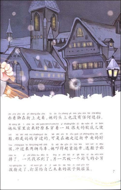 小女孩找了一个墙角坐了下来,冷得缩成一团,然而她更加冷了。她没卖出一根火柴,没挣到一个铜板。她怕爸爸会打她,不敢回家。回到家里也不会暖和多少,家里空荡荡的,冷风从破旧的屋顶上嗖嗖地灌进来。她的两只小手已经被冻麻了。“哎呀,或许点根火柴会暖和些。”她想。