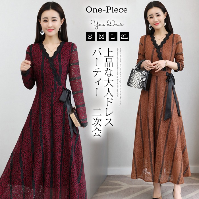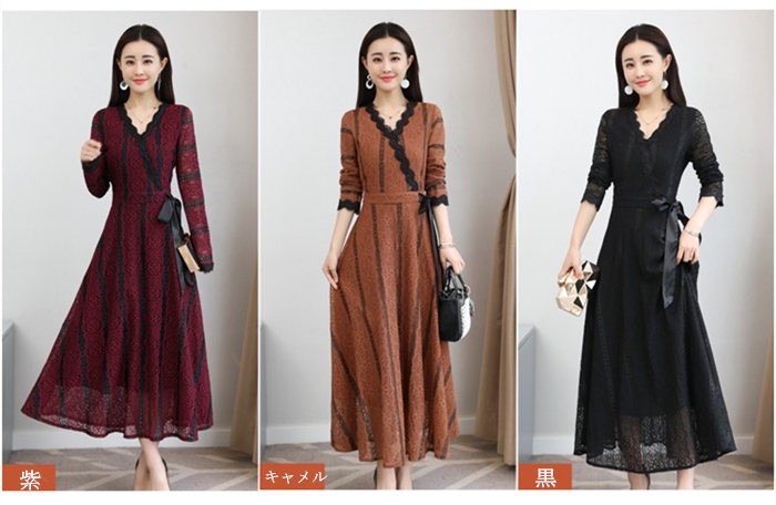【キーワード】パーティードレス 結婚式 ワンピース ドレス お呼ばれ 二次会 披露宴 パーティー レディース フォーマル 20代 30代 40代 50代 フレアAラインワンピース レースワンピース ロング丈 マキシワンピース 長袖 マキシワンピ Vネック ロング丈ワンピース ベルト付き マキシワンピース ウエストリボン 大人 可愛い 秋ワンピース aラインワンピース 黒 キャメル 紫 S M L 2L 【生産地】:中国【素材】:レース・ボリエステル【カラー】:黒 キャメル 紫※お客様ご使用のPC環境により商品画像のカラーが多少異なる場合があります。仕入時期により多少デザインなど異なる場合があります。ご了承ください。【サイズ(単位cm)】:S:バスト86 ウエスト68 肩幅36 袖丈57 着丈117M:バスト90 ウエスト72 肩幅37 袖丈58 着丈118L:バスト94 ウエスト76 肩幅38 袖丈59 着丈119XL:バスト98 ウエスト80 肩幅39 袖丈60 着丈120※サイズは人の手によって測っているため、実寸は商品によって(2-3 cm前後)に誤差が生じる場合がございますので、予めご了承くださいませ。