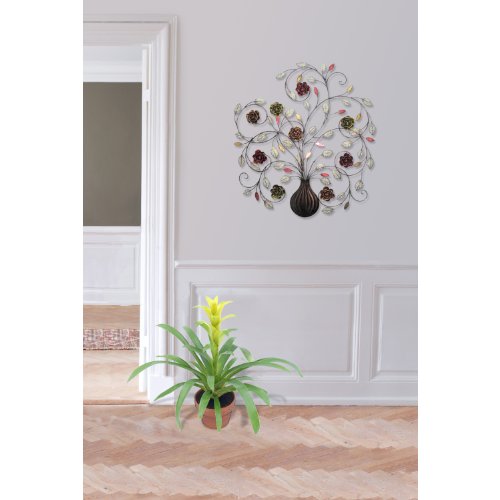 - This metal wall hanging features a small vase with an explosion of decorative flowers