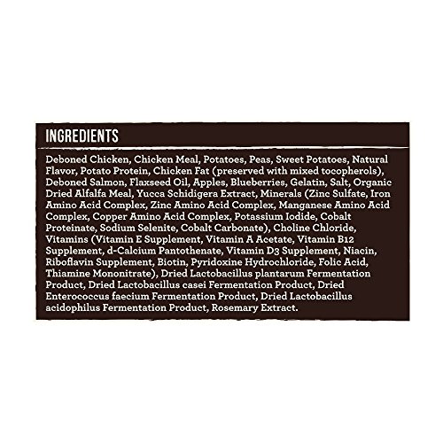 原材料:骨抜きチキン、チキンミール、ポテト、エンドウ豆、スウィートポテト、ナチュラルポークフレーバー、ポテトタンパク、チキン脂肪(ミックストコフェロールで保存)、ナチュラルチキンフレーバー、骨抜きサーモン、リンゴ、ブルーベリー、酵母培養液、オーガニックアルファルファ、塩化カリウム、サーモンオイル、塩、ミネラル類(亜鉛アミノ酸、硫酸亜鉛、鉄アミノ酸、マンガンアミノ酸、銅アミノ酸、ヨウ化カリウム、コバルトアミノ酸、亜セレンサンナトリウム)、ビタミン類(ビタミンE、ビタミンA、ビタミンB12、d-パントテン酸カルシウム、ビタミンD3、ナイアシン、リボフラビン、ビオチン、塩化ピリドキシン、葉酸、硝酸チアミン)、塩化コリン、ユッカシディジラスエキス、乾燥乳酸プランタラム菌発酵製品、乾燥乳酸カゼイン菌発酵製品、乾燥腸球フェシウム菌発酵製品、乾燥乳酸アシドフィルス菌発酵製品