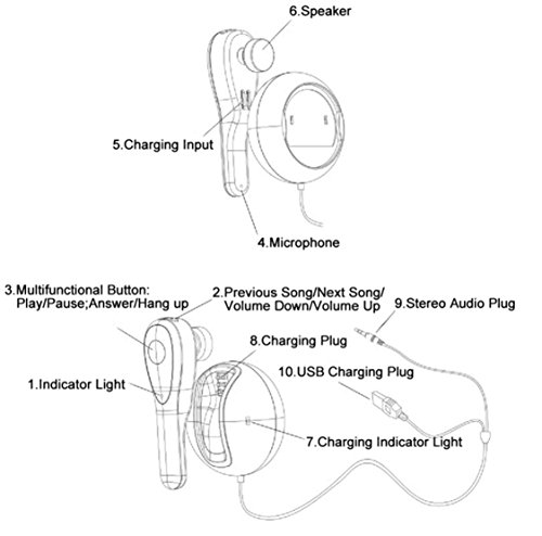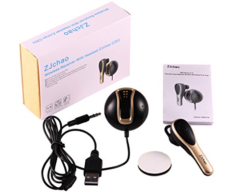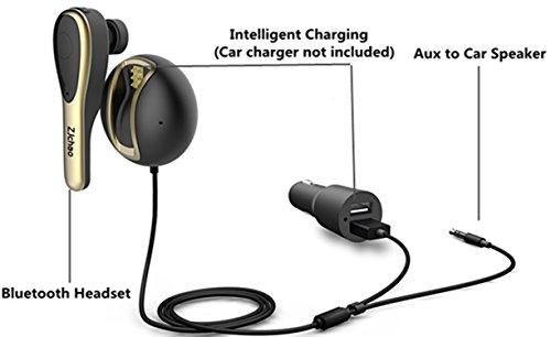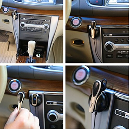 - Feature : Bluetooth wireless headset, could connect with two devices via bluetooth 4.1 to answer phone calls, or play musics / Car hands free driving, pick up the bluetooth earpiece, it allows fpr private convensitions with the other end of the phone call. It also enable for three-way phone calls if your phone supports / Works stably as a bluetooth receiver to transmit the audio to you car speaker system by the Aux input / With a detachable charging dock, the headset could be magnetically put on the dock for charging though your car chargers. Once the bluetooth is disconnected, the headset would turn off automatically for energy saving / Easy to use: attached the charging dock on your car, charging it with your car charger and plug the aux 3.5mm input to your car audio streaming sound system, pair with your device, and then you could listen to music or takings calls