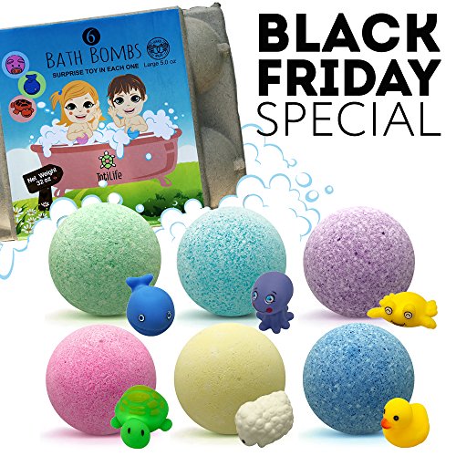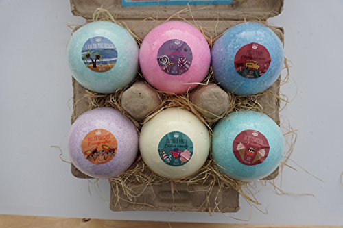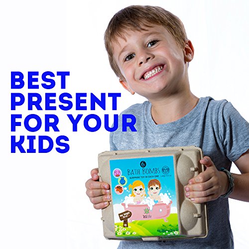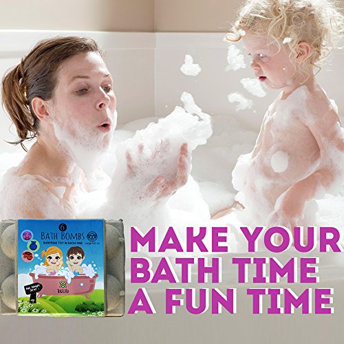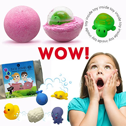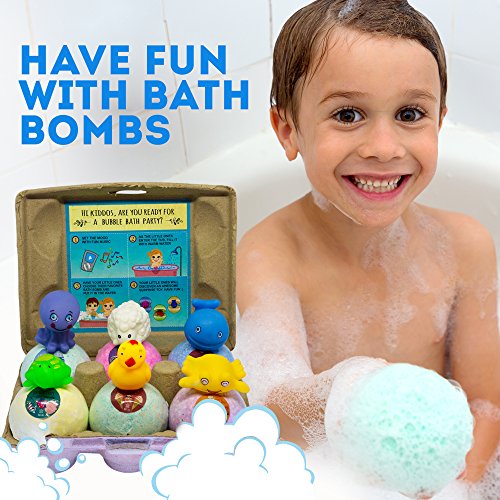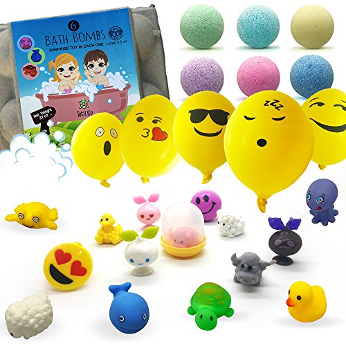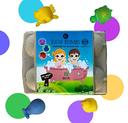 6 COLORED BALLS ? Each a different color to pick bathe SURPRISE TOYS ? When the bombs are placed in water dissolve, small rubber toys appear in plastic casings LARGE SIZE ? 4.5 ounces SAFE SCENTED INGREDIENTS ? Cleans without damaging skin smells good SAFETY - Not for children under 3 years of age HANDMADE ? Not assembly-line produced EASY TO USE ? Drop in water fizzes EGG CONTAINER ? Store balls or recycle