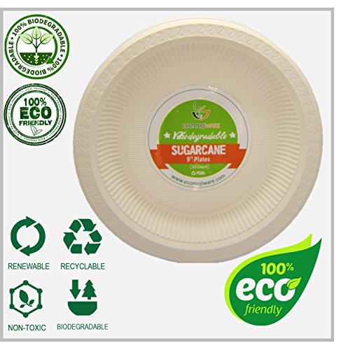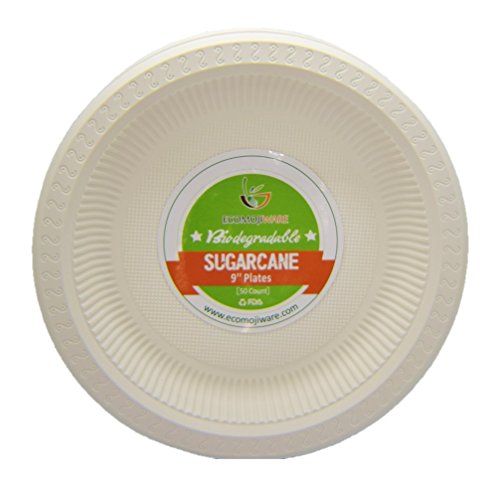 Plates - by EcoMojiWare.com - 9" Certified Compostable Plates (50 Pack), Made From Sugar Cane