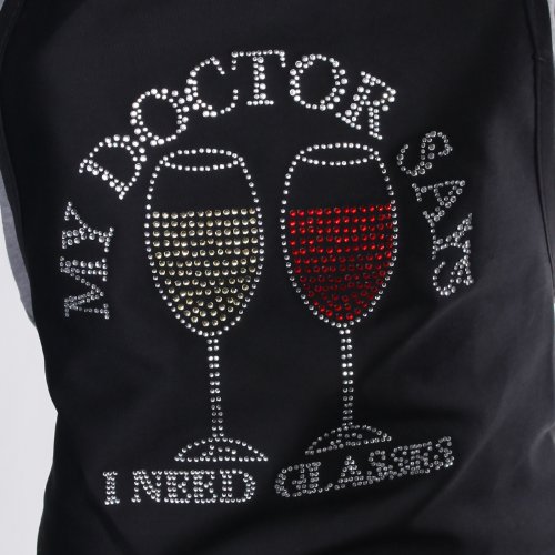 - Feature : Make a fashion statement with this fun apron! / Cotton/polyester bib style apron / Rhinestone crystal "My Doctor Says I Need Glasses" decoration / Ties in back, divided patch pocket / One size fits most adults