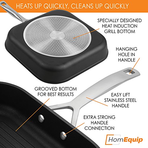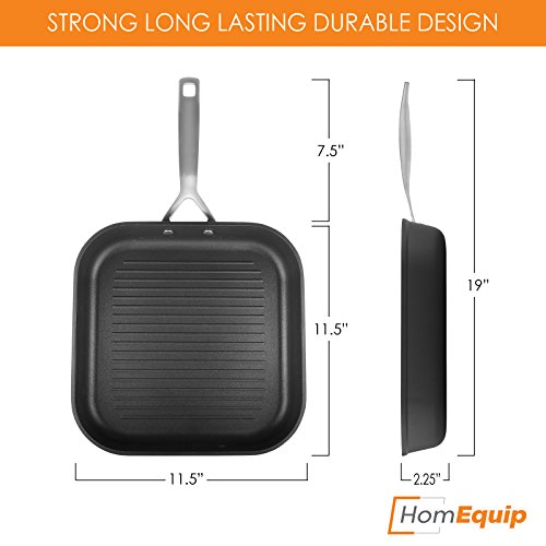 No kitchen is complete without this quality design grill pan. Grill meats, vegetables and proteins to perfection with the 11 inch Square Grill Pan from HomEquip. Whether you're an amazing at home cook or a professional chef this ergonomically designed skillet makes cooking delicious meals effortless.QUALITY DESIGN